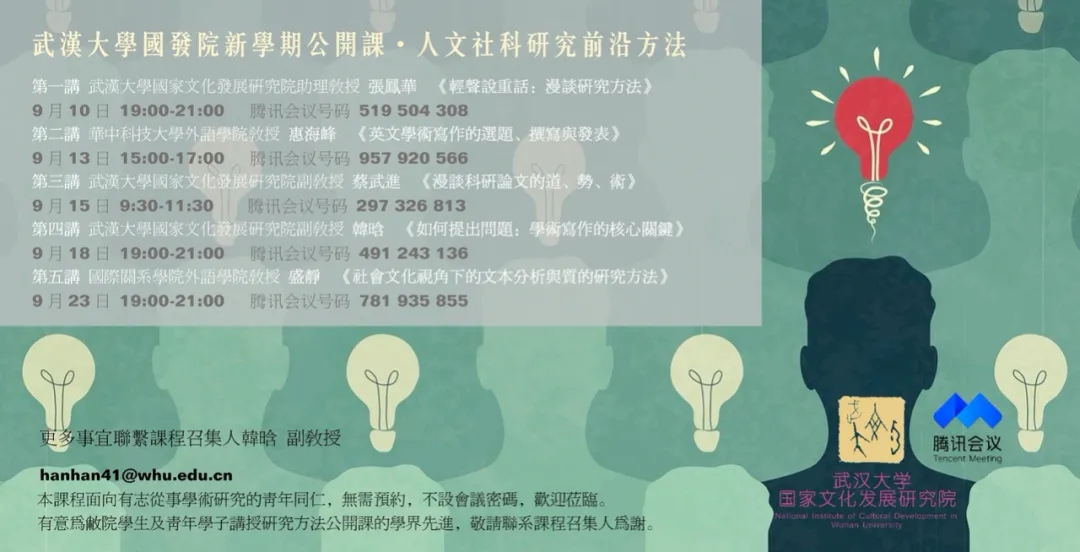 2020年9月10日—23日,由武汉大学国家文化发展研究院主办、我院研究生会负责统筹的“新学期公开课·人文社科研究前沿方法”(第一季)圆满收官。本系列讲座由我院韩晗副教授担任课程召集人,遍及文学、历史、经济、政治等各学科国内外十五位知名青年学者、学术编辑与数据库工程师倾力支持,针对前言研究方法、学术写作与学术规划等问题向各位青年学子传经送宝。第一季的五场讲座在腾讯会议成功举行,同时在国内最大在线教育平台“学术志”进行公益实时转播。后台数据显示,我院公开课第一季的旁听人数累计过万人,遍布美国、日本、欧洲、东南亚等国家与地区以及我国二十余个省份的高等院校,已成为“学术志”平台上最受欢迎的人文社科类公开课之一。