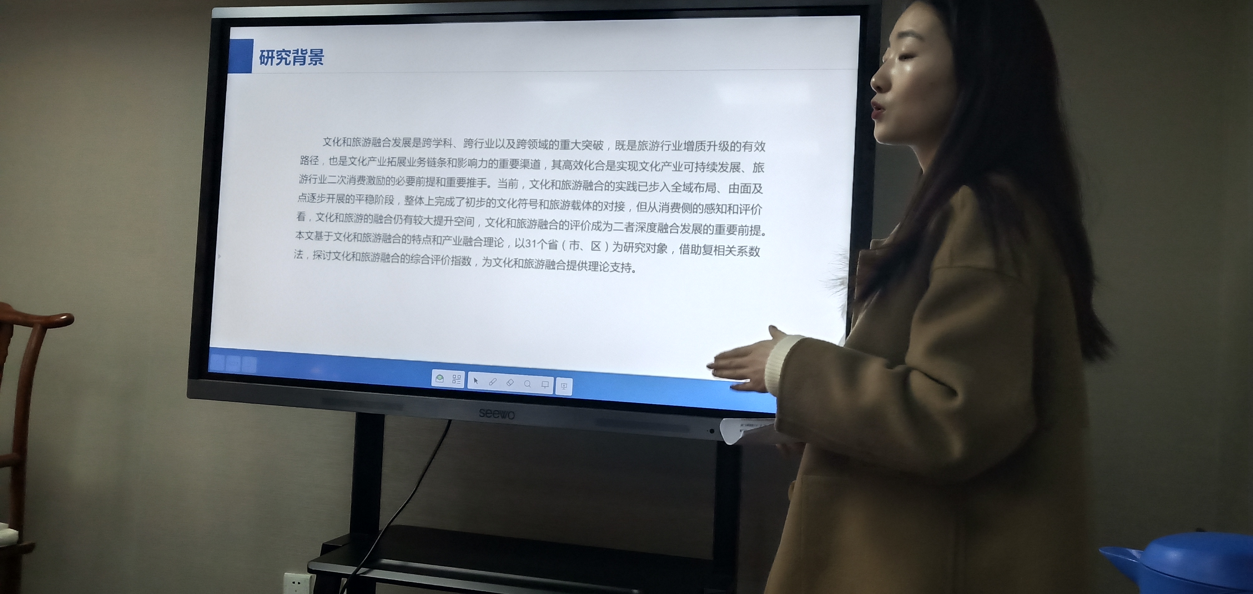 在评阅交流环节,王诗怡和柳东民同学认为文章理论扎实、逻辑自洽,在文章标题界定、数据收集与处理、指标的针对性与细致性等方面提出问题。金海涛、延书宁和刘锦同学分别针对指标的创新性、文化和旅游融合的界定等方面提出疑问。陈庚老师认为文章功底较为扎实,方法新颖,但是文章没有指出文化和旅游融合的具体内容,在指标选择上,需要关注指标的相关性,二、三级指标应该选择核心的、基础的、明显的指标。寇垠老师指出可以建立文化和旅游的框架系统,用逻辑图阐释文化和旅游融合的内涵。同样,寇老师也认为文章选取的指标逻辑性不强,建议先进行预调研,再对数据处理分析。